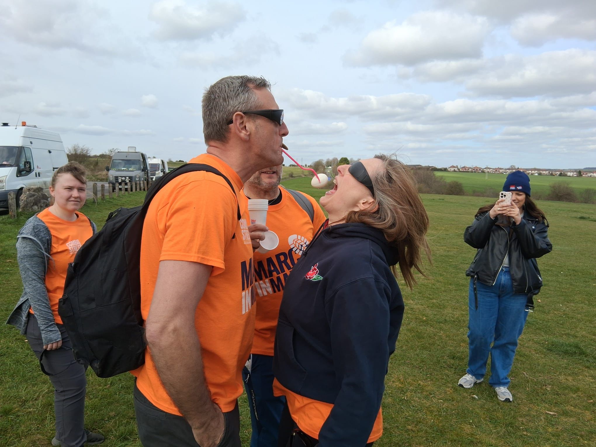 At each mile point a task was added to make the challenge even trickier, from eating pickled eggs off a fork blindfolded to walking with a creme egg between the knees.