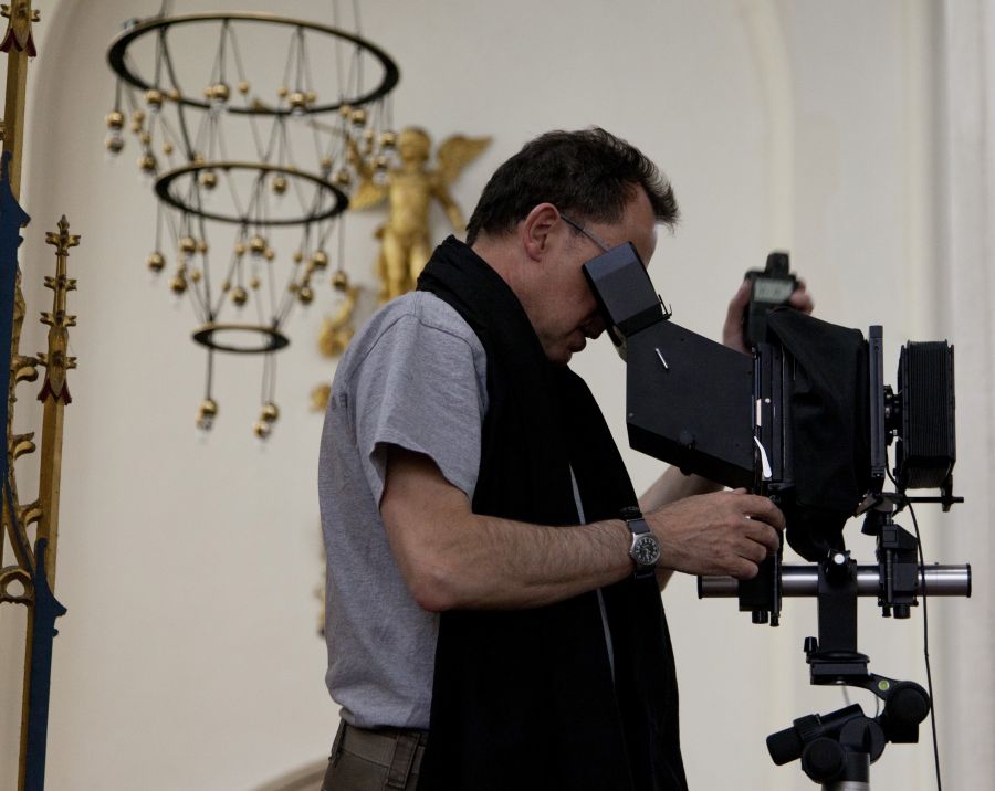 “Each was taken at dawn, with the lights extinguished, using Fuji film. They distil the moment where cathedral buildings emerge into the day.