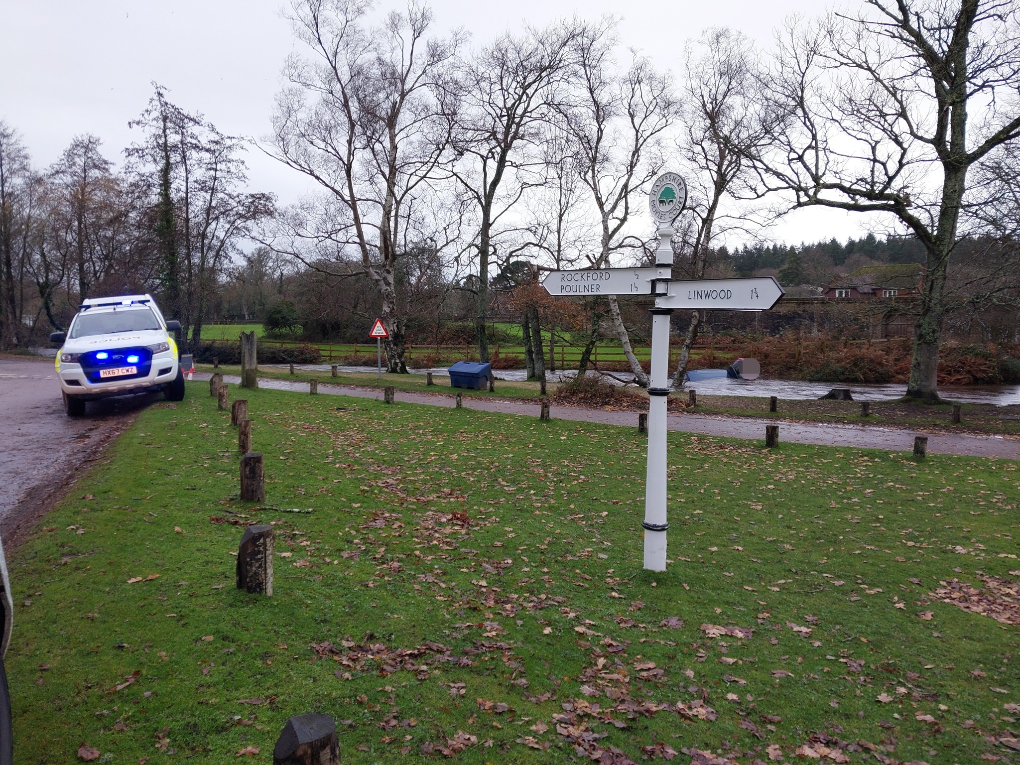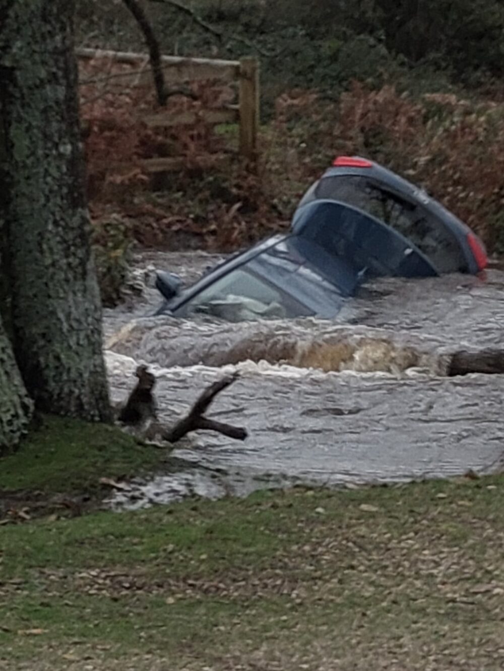 The ford at Moyles Court is currently closed. In a recent incident, a driver attempted to reverse out after only the front tyres entered the ford, but the vehicle was quickly carried deeper by the current. The driver made the correct decision to leave the vehicle and prioritise safety over property.