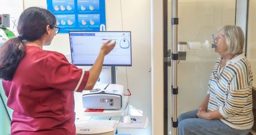 Kirsty Dudin using the new lung function machine.