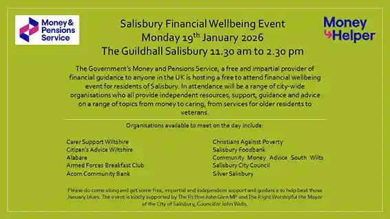 The Guildhall Market Place, Guildhall Square, Salisbury, SP1 1JHThe Government’s Money and Pensions Service, a free and impartial provider of financial guidance to anyone in the UK is hosting a free to attend financial wellbeing event for residents of Salisbury. In attendance will be a range of city-wide organisations who all provide independent resources, support, guidance and advice on a range of topics […]