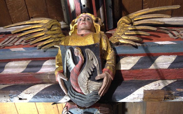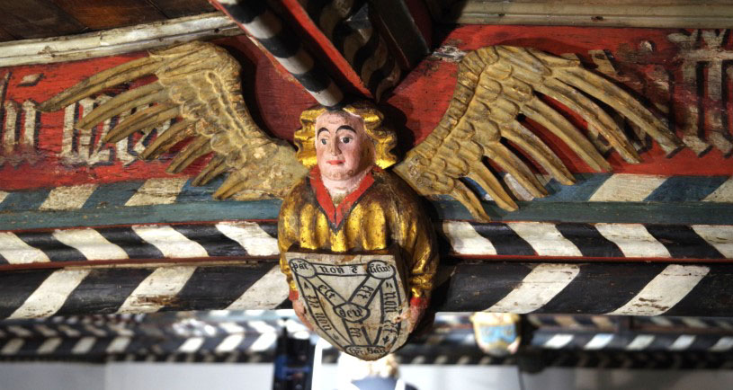 A whole host of angels, resplendent in vivid colours, are set against striking red, gold and striped ceiling beams.